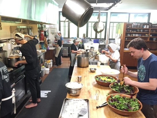 With all gatherings at DBZ, there is a social joy that is vibrant, even for O-bon and its focused on those in our communities and lives who have died. The spirit of collaboration was as nourishing as the food we prepared. Making an elaborate dinner for 75 was, fast-paced, meditative and straight-up fun. I and others assisted the tenzo, or head chef, to prepare dinner starting immediately after breakfast right up to 5PM serving time. We  working along side those making lunch at the same time. All day the sky and air were heavy with the possibility of rain, but inside we were basking in our own sunshine.